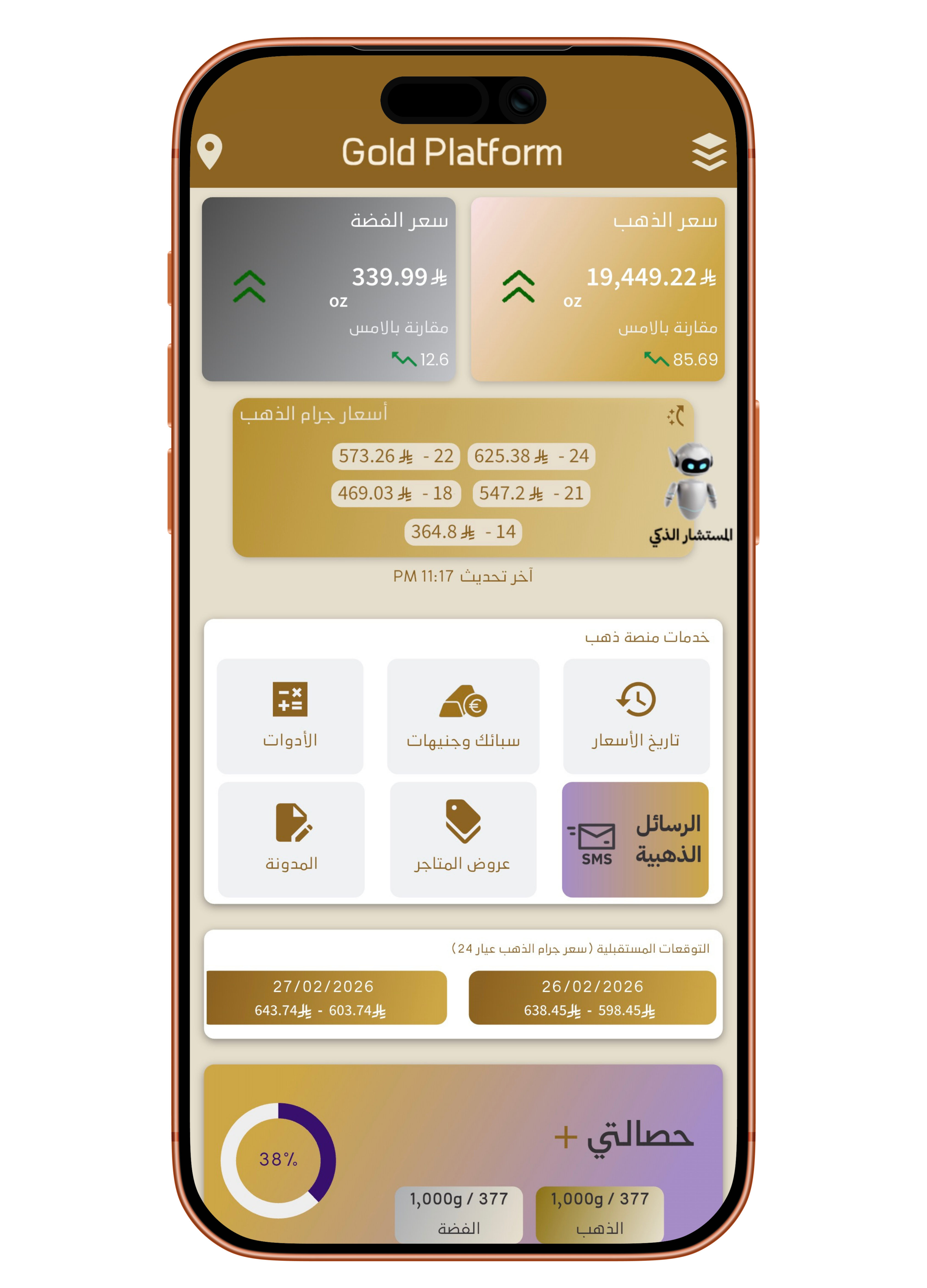 Gold Platform delivers real-time gold and silver prices with instant updates, along with comprehensive historical data covering up to 10 years and future forecasts to support informed saving and investment decisions. It includes precise financial tools such as Zakat and buy/sell calculators, nearby store discovery and offers, in addition to AI Advisor system for building personalised saving plans powered by artificial intelligence, and the Golden Messages service delivering daily price updates directly to your phone. Designed to combine clarity, precision, and ease of use.