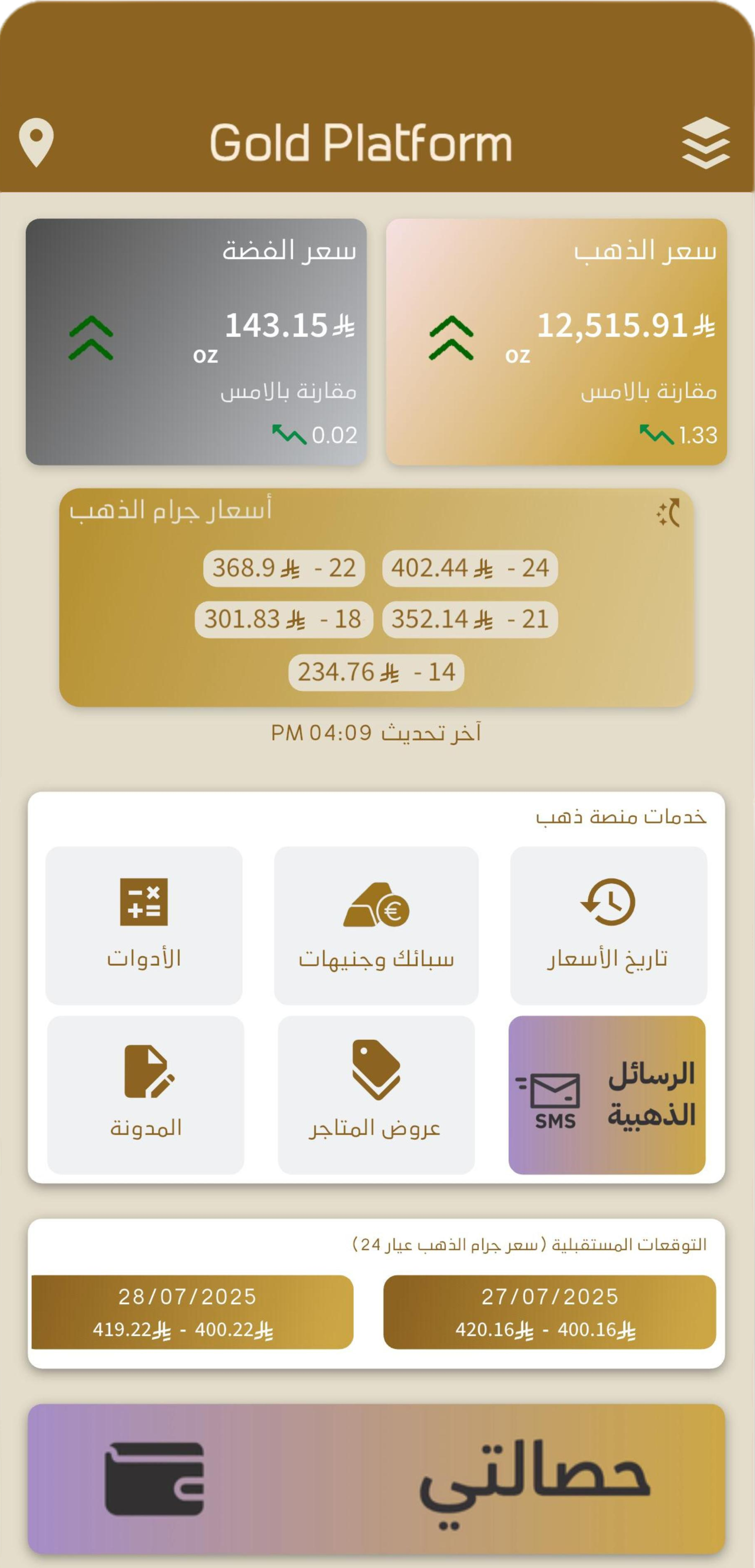 The Gold Platform app delivers real-time gold and silver prices with instant updates. It includes smart tools such as a Zakat calculator and accurate buy/sell calculators. Access historical data covering up to 10 years, along with future price forecasts to support informed investment decisions. Discover nearby gold stores and explore current offers. The app is designed for simplicity, clarity, and ease of use.