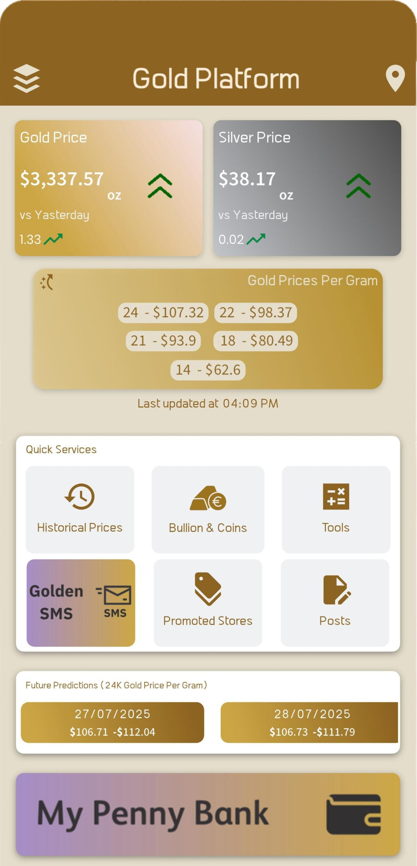 Gold Platform is a digital platform designed to deliver real-time gold and silver prices, along with intuitive tools that empower smart, confident investment decisions.